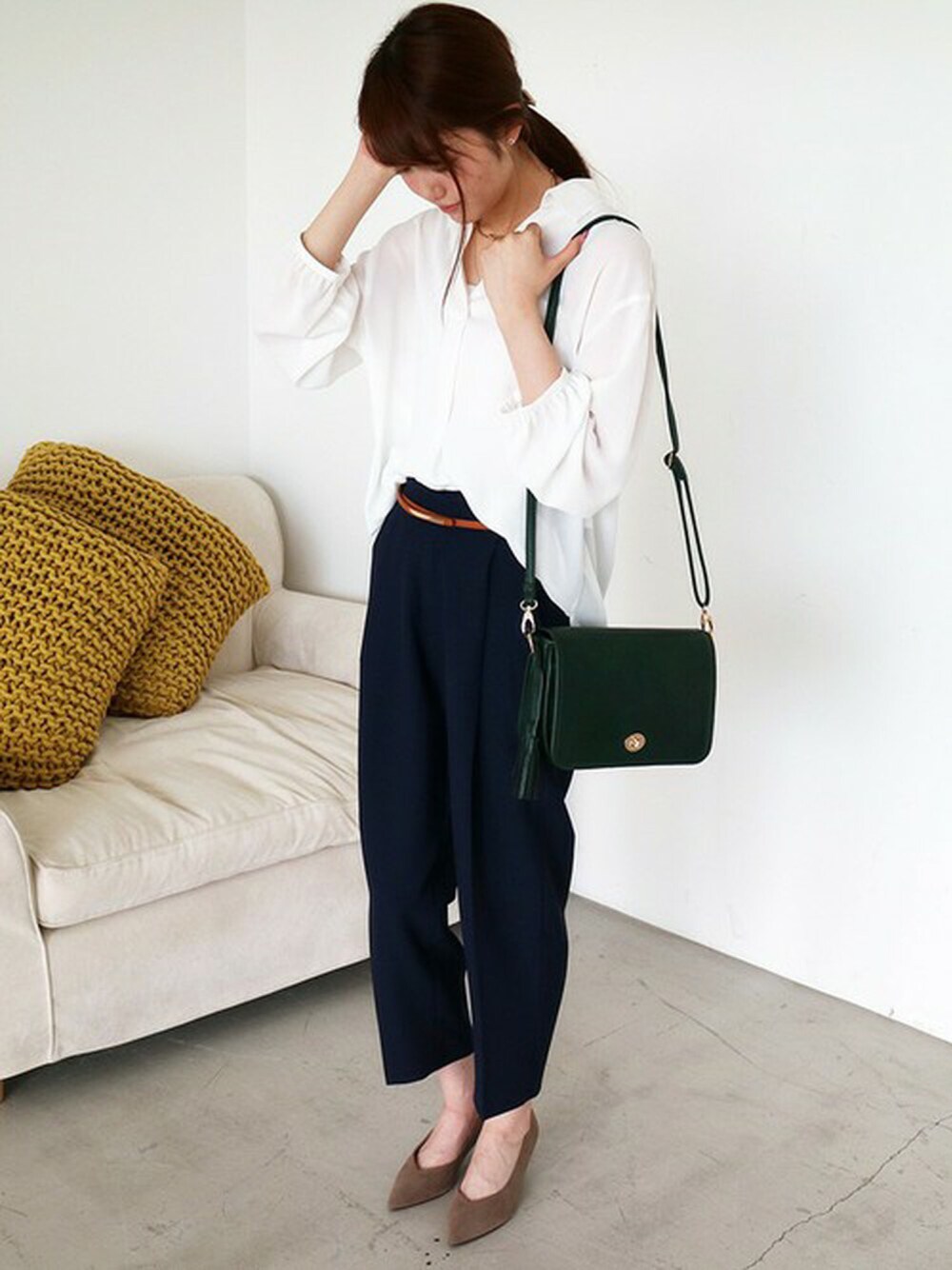 スキッパーシャツにハイウエストパンツで 今年らしいコーディネート。 足首を見せてスッキリと♪