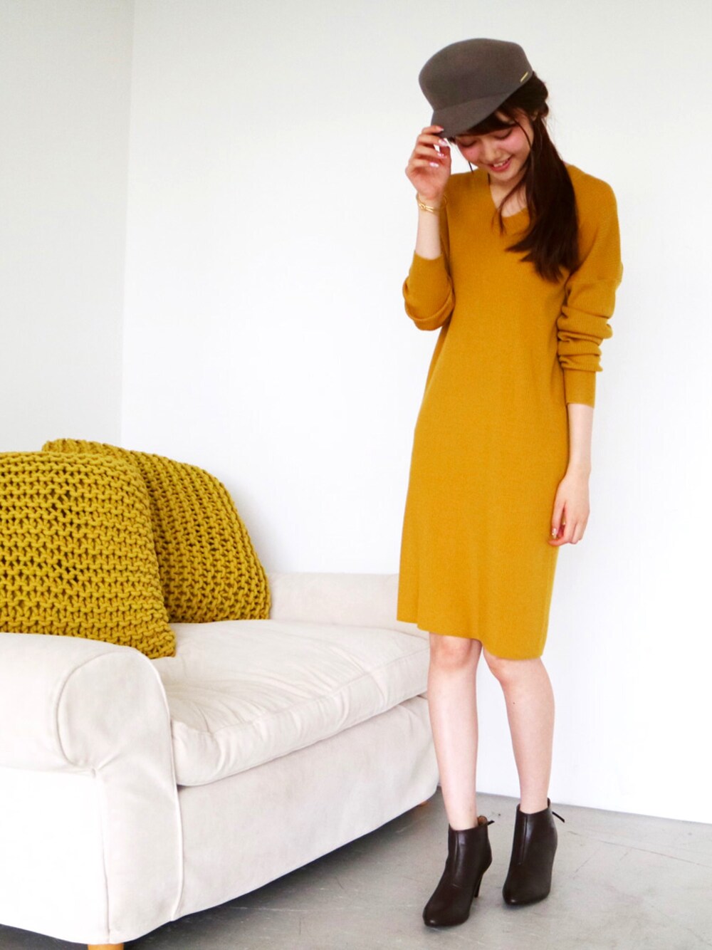 毎年人気のウールベーシックニットシリーズ! 目を引くイエローで、可愛らしく♪ ストンと落ちるストレートシルエットで体型カバーもバッチリ★ 小物をブラウンでまとめると秋らしさもグッと増します。