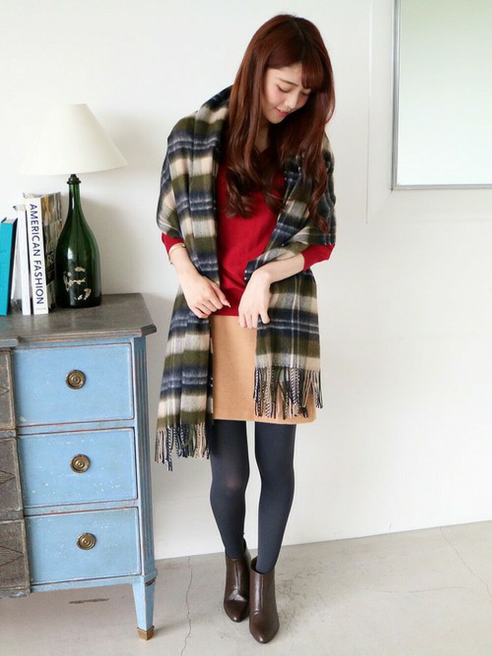 シンプルなコーデには、柄ストールでアクセントを♪ 肌寒い今の時期に使いやすいアイテムです。 ニットはVネックで首回りをスッキリと!