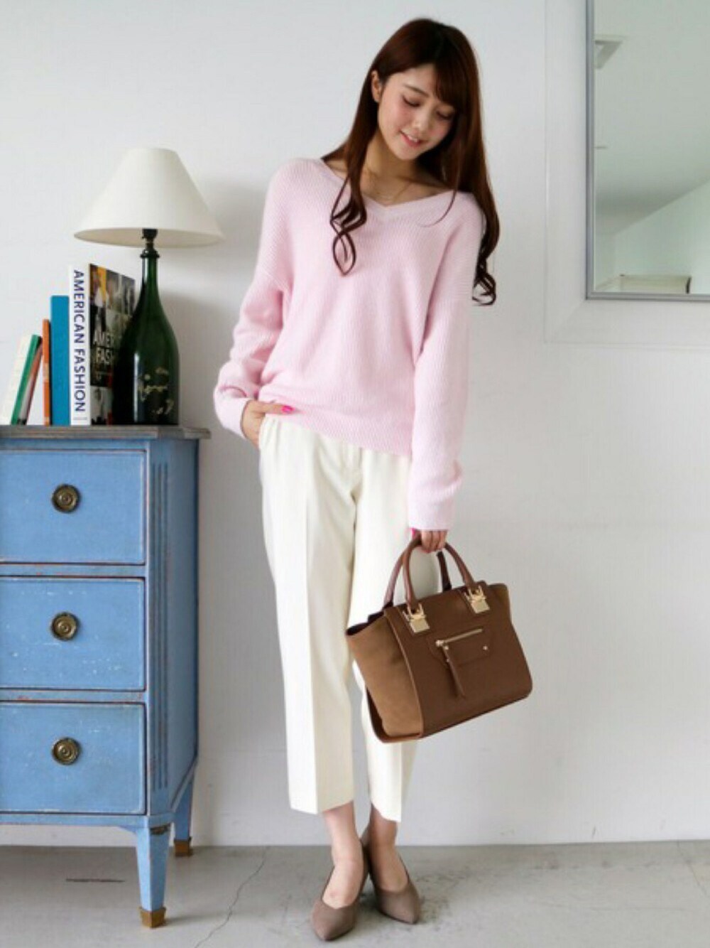 可愛らしいピンクも、広めVネックで大人っぽく。 柔らかい、ベージュやグレージュの小物を合わせて、女っぽいオフィスコーデの完成です♪ 【ZOZOTOWN ¥2,000クーポン配布中!】10/9~10/11まで