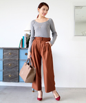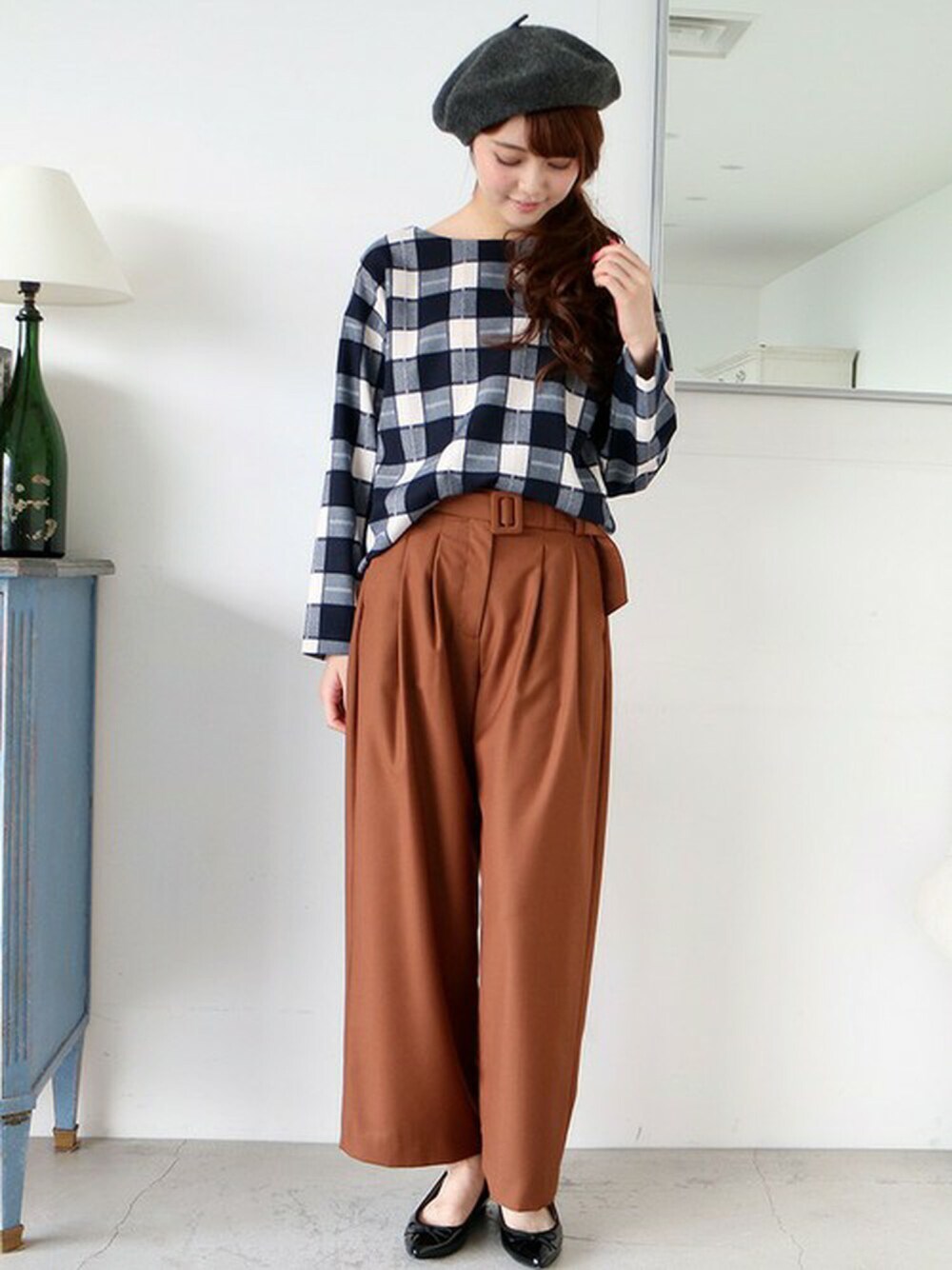 大きめチェックが目を引くトップスはワイドパンツで 今年らしいレトロカジュアルに♪ ボートネックで首回りすっきりと!