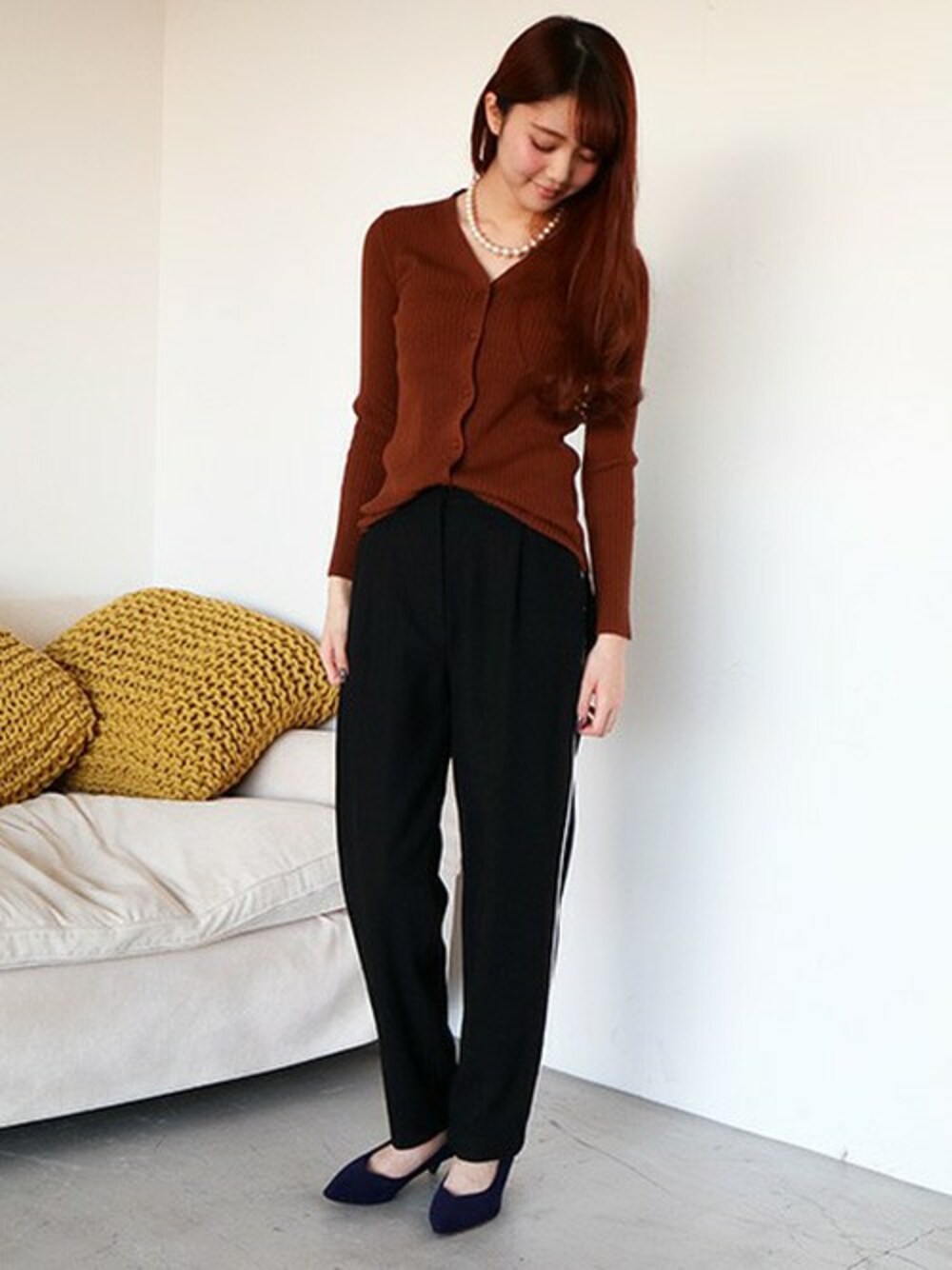 サイドにラインが入ったパンツは、スポーティーテイストな雰囲気に♪ ヒールや、パールネックレスなどきれいめ小物でカジュアル過ぎず女性らしい印象に。