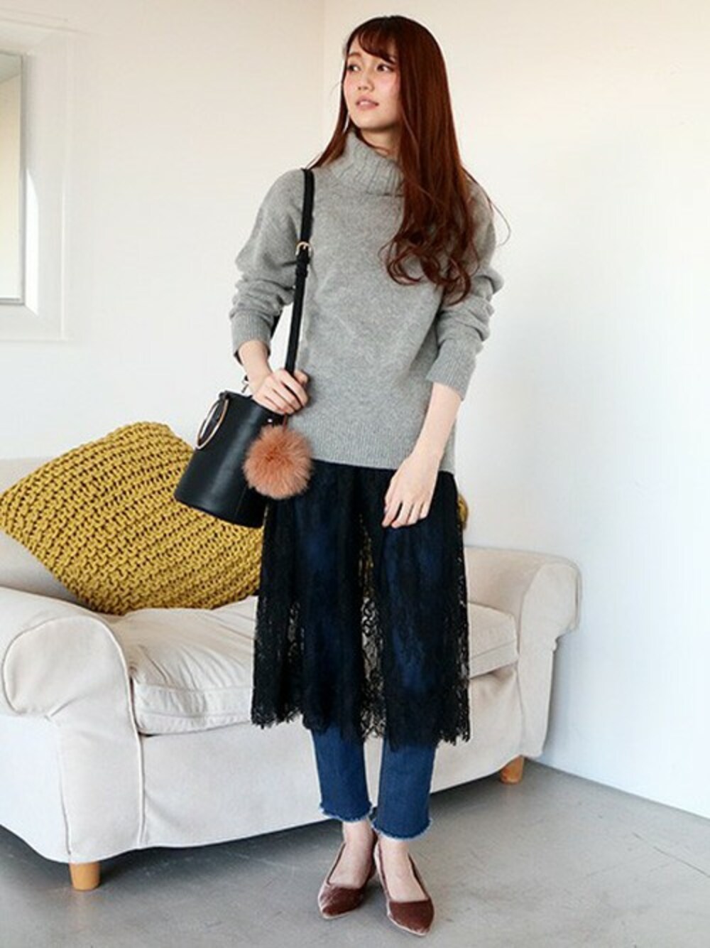 レースレイヤードが今年らしいコーディネート。 レーススカートはインナーが取り外しできるので、スカートとしても着れますよ♪ リラックス感のあるニットで、ゆるカジに!