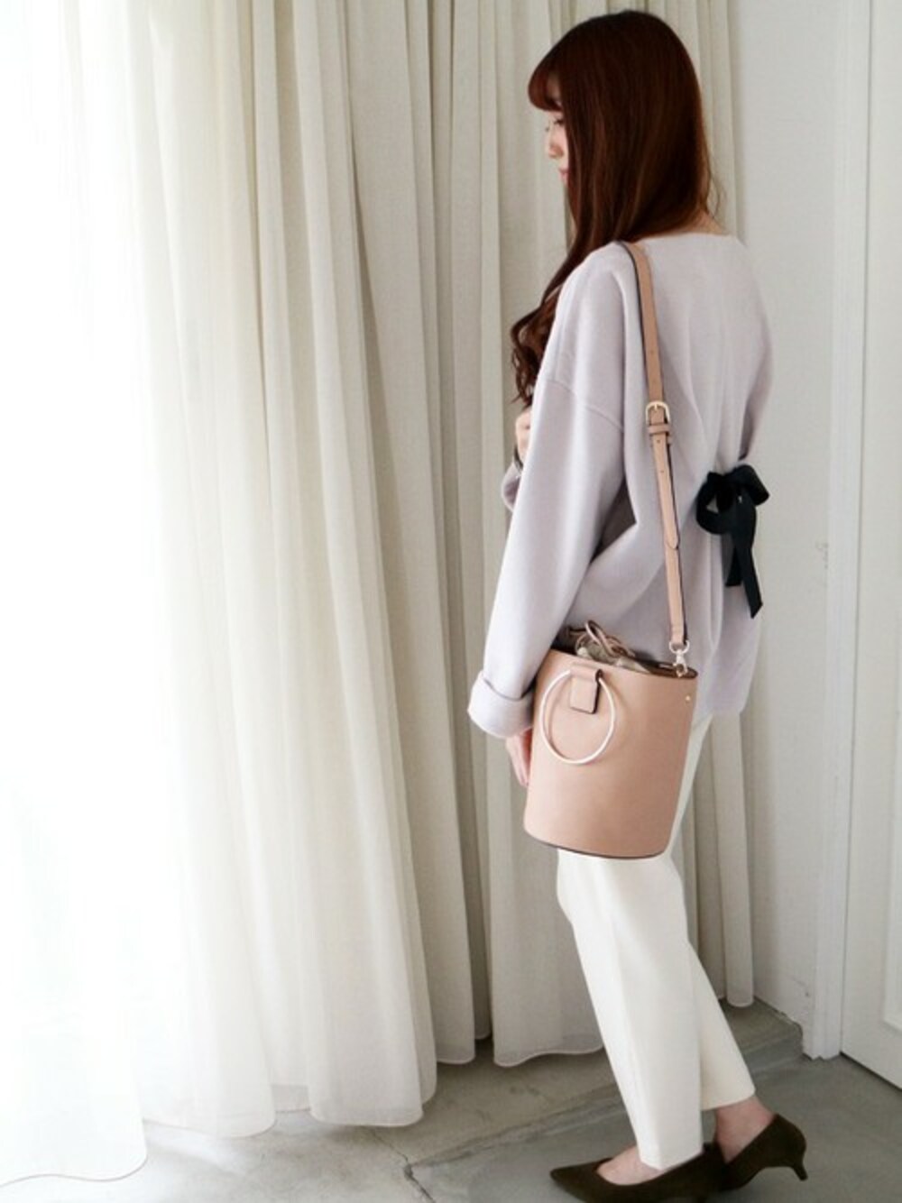 起毛感のあるカットソー生地で仕立て、女性らしいソフトなシルエットを演出する1枚! 後ろは、大胆にグログランリボンでデザインを加え、いつものスタイルも大人可愛いを狙えそう♪