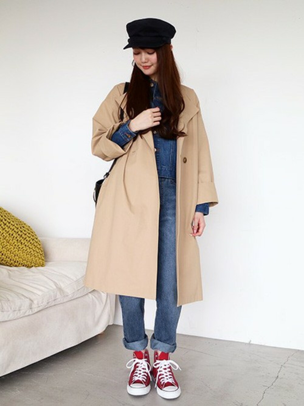 程よいハリ感で、体をすっぽり包み込むようなオーバーサイズのスプリングコート。 ノーカラーなので、Gジャンなど襟があるアイテムとのレイヤードも◎♪ 今年は袖を折ってインナーをチラ見せするのがオススメです!