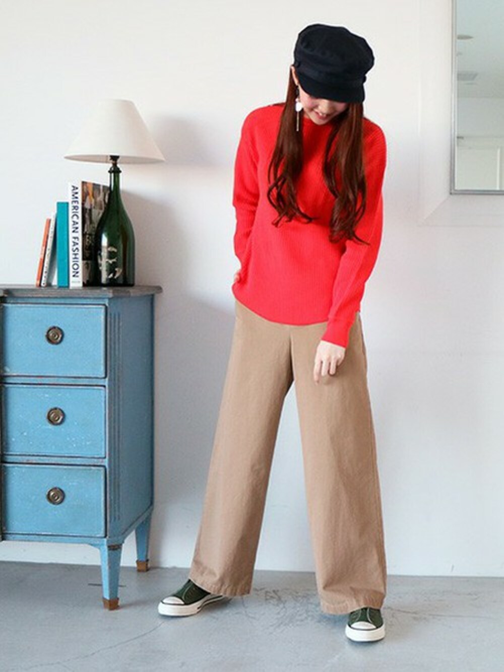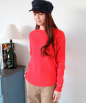 鮮やかなレッドが可愛いワッフルニットは、前後差があり外に出して着てもバランスよく着こなせます♪たまにはボーイッシュなカジュアルスタイルも可愛い!