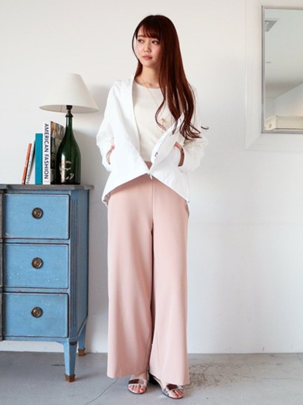 マウンテンパーカーもきれいめボトムと合わせれば、カジュアル過ぎずに大人っぽい印象に♪ ホワイト×ピンクで可愛らしさもプラスしました☆