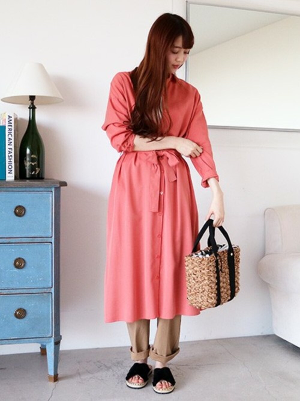 以前ご紹介したシャツワンピの着回し♪ 前を閉めてシャツワンピ風に着こなすのも印象が変わってマンネリ対策!サッシュベルトに変えてみてもGood★