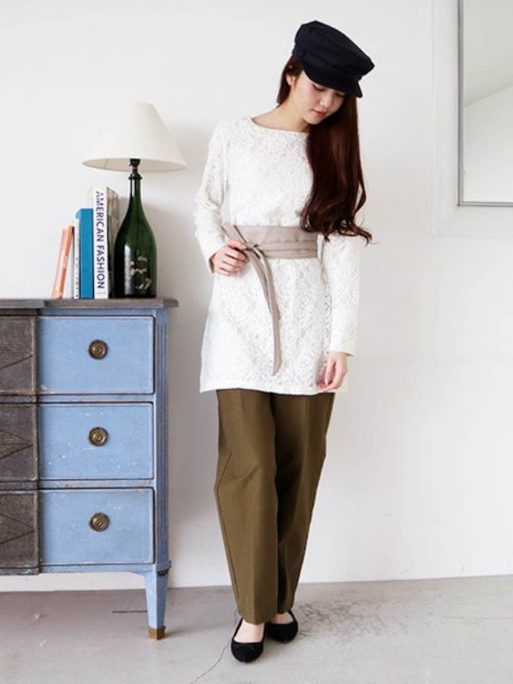 今年定番のレイヤードスタイル。レース×ワークパンツでキレイめカジュアルに! サッシュベルトも欠かせません!!! ★ZOZOTOWN 全品対象\1,000クーポン配布中!!2/24~2/25 23:59まで★