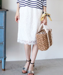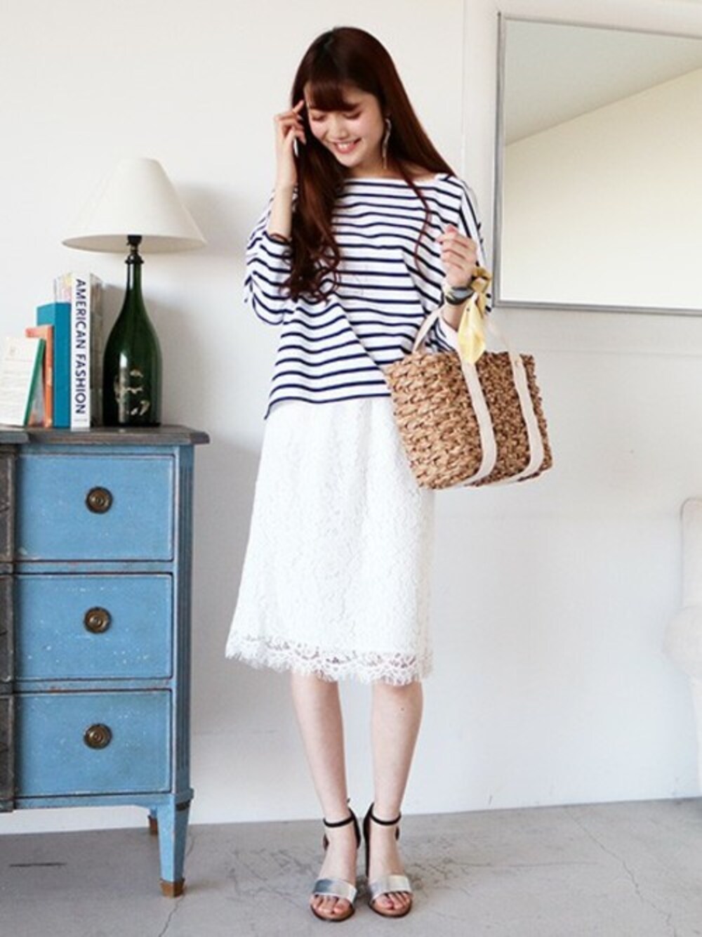 カジュアルな度詰めボーダートップスも、繊細なレーススカートと合わせれば女性らしいスタイルに♪ カゴバッグやスカーフでマリンテイストに。