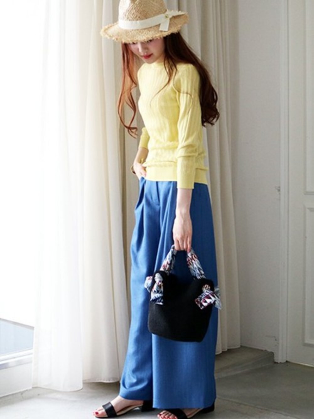 適度なフィット感がトレンドボトムにもマッチする、コットンモダールニット! 1枚着はもちろん、レイヤードのインナーとしても大活躍♪ 今年はカラー×カラーがおすすめ!ブルーとイエローで爽やかな雰囲気に。
