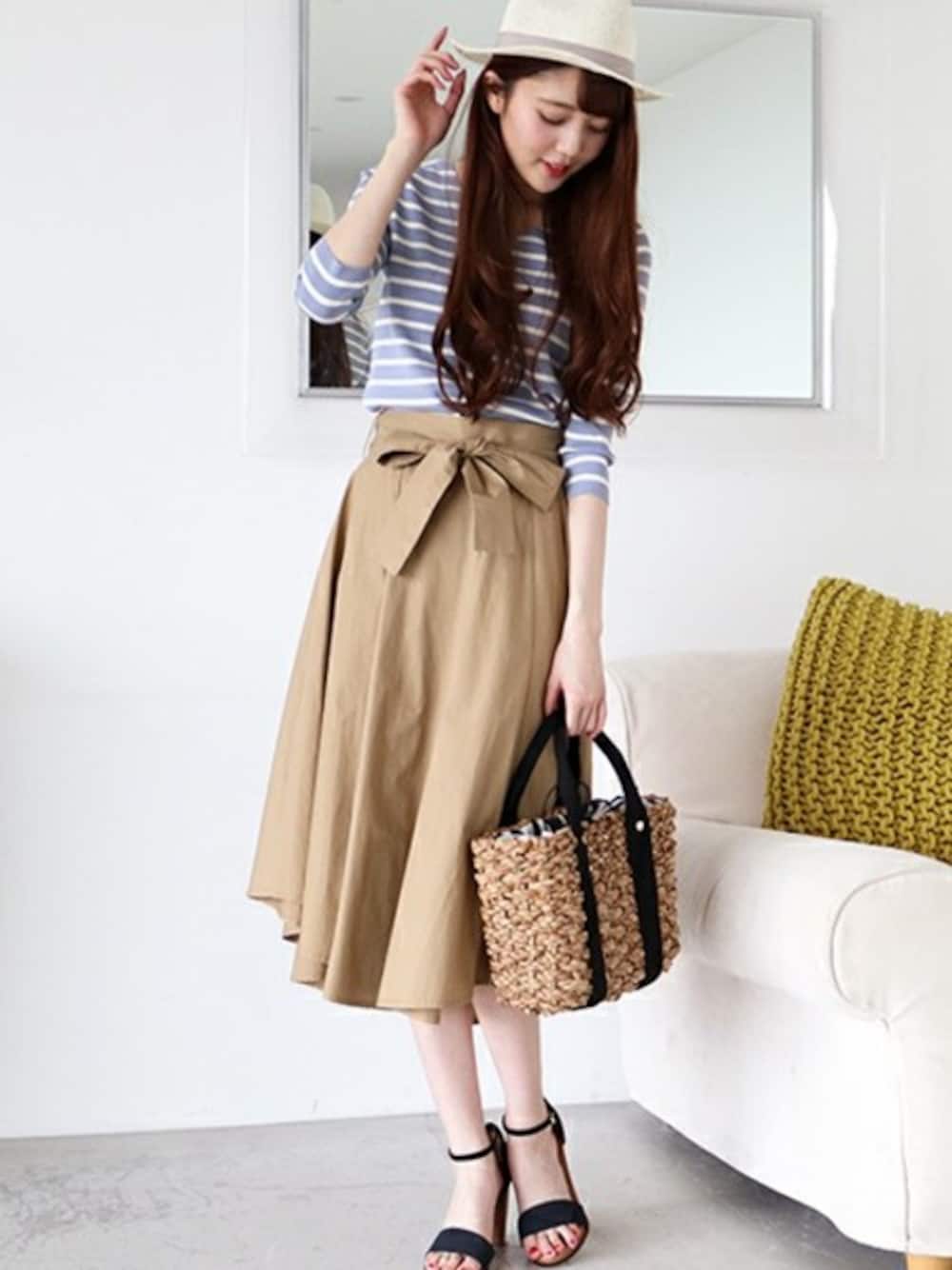 大人見えする総針ニット!今季はボーダーもカラー展開でご用意! ブルー×ボーダーや雑材小物で爽やかマリンコーデ♪ ボリューム感のあるイレギュラーヘムスカートでガーリーな印象に。