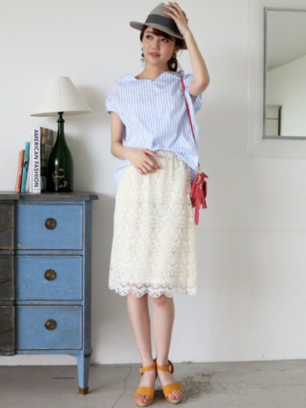 1枚で春の訪れを感じさせてくれるフラワーレーススカート♡ 裾部分まで広がるレースとホワイトカラーで爽やかな印象に♪ これからの季節にぴったりなきれいめカジュアルコーデです!