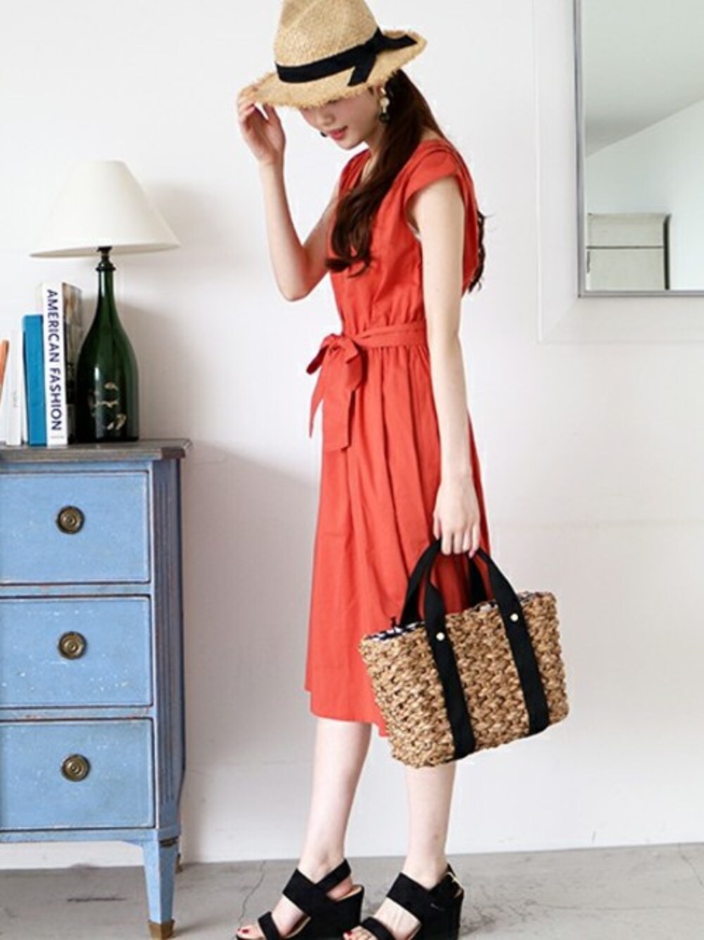 大きなウエストリボンがかわいいワンピース♪ 少しくすんだオレンジが派手すぎずおしゃれ感UP★ 小物はダークカラーでまとめるのがポイントです! ★ZOZOTOWN \2,000クーポン配布中!! 本日最終日!4/15 23:59まで★