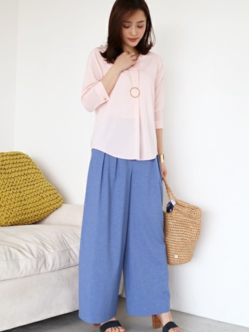 程よいゆとりのあるフォルムが今年らしいブラウス! 鮮やかなピンク×ブルーの爽やかコーデ★ こなれ感漂うきれいめカジュアルstyleです♪