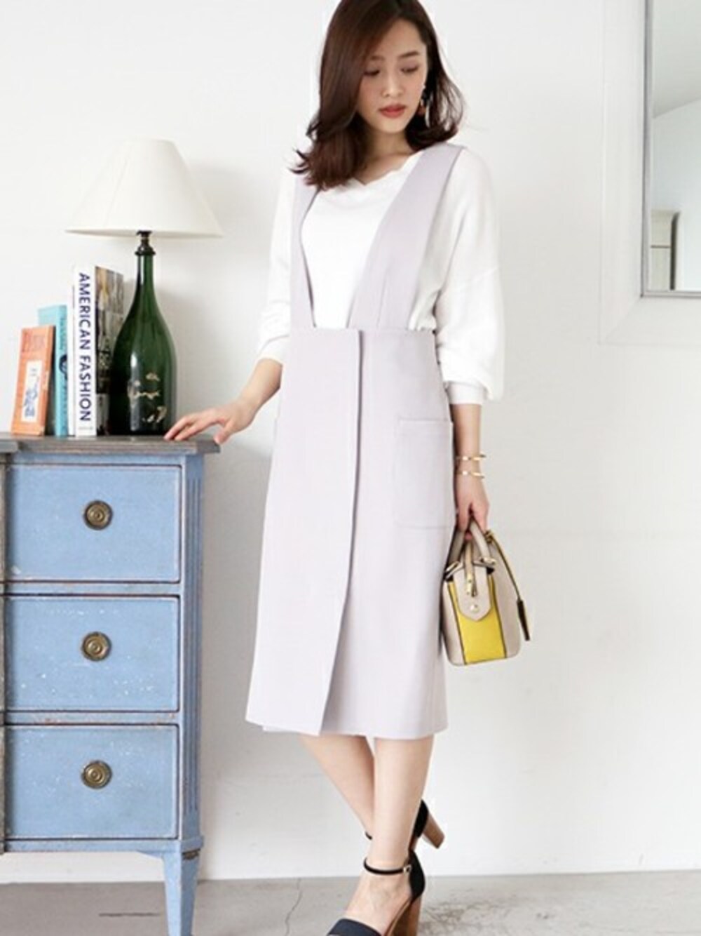 レイヤードstyleがおしゃれに決まるBIGポケットジャンスカ! きれいめな生地と縦長シルエットで甘すぎない大人な印象に♪ Tシャツやブラウスなどどんなインナーとも相性抜群★