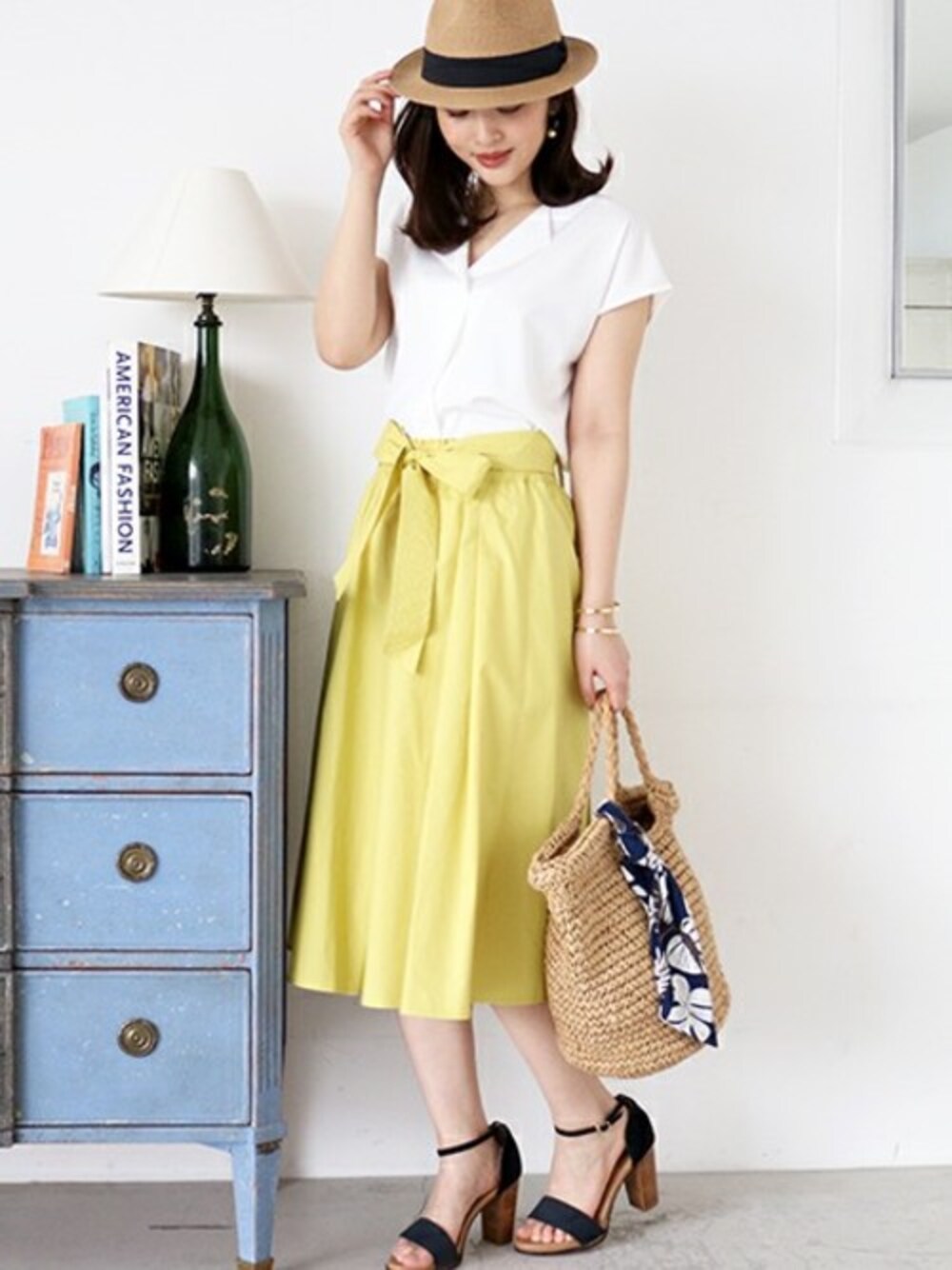 ジョーゼットの柔らかい生地で女性らしさを維持できるドロップスリーブブラウス! シンプルながらも襟元のデザインやドロップショルダーが今年らしい1枚★ 爽やかなイエロー×ホワイトできれいめカジュアルstyleに♪