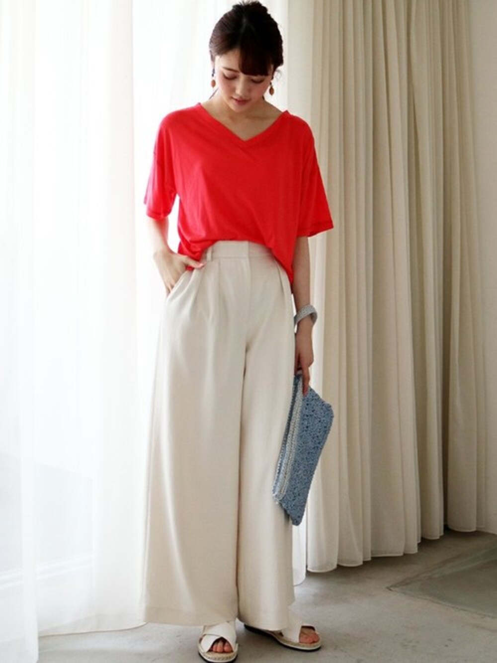 縦長を印象づけるガーデンツイルパンツ! すとんと落ちるワイドシルエットで柔らかく大人見えする風合いに。 爽やかなホワイトにビビットカラーを合わせた大人カジュアルstyle★