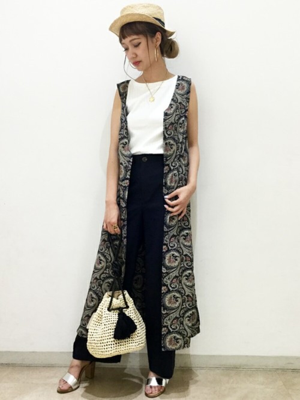 ワンピースやロングジレとして2通り着こなせるアイテム! レトロなペイズリー柄は、深みのある大人見えな配色でおしゃれ度UP★ 釦をあけて、ワイドパンツと合わせた夏らしいリラックスstyle♪