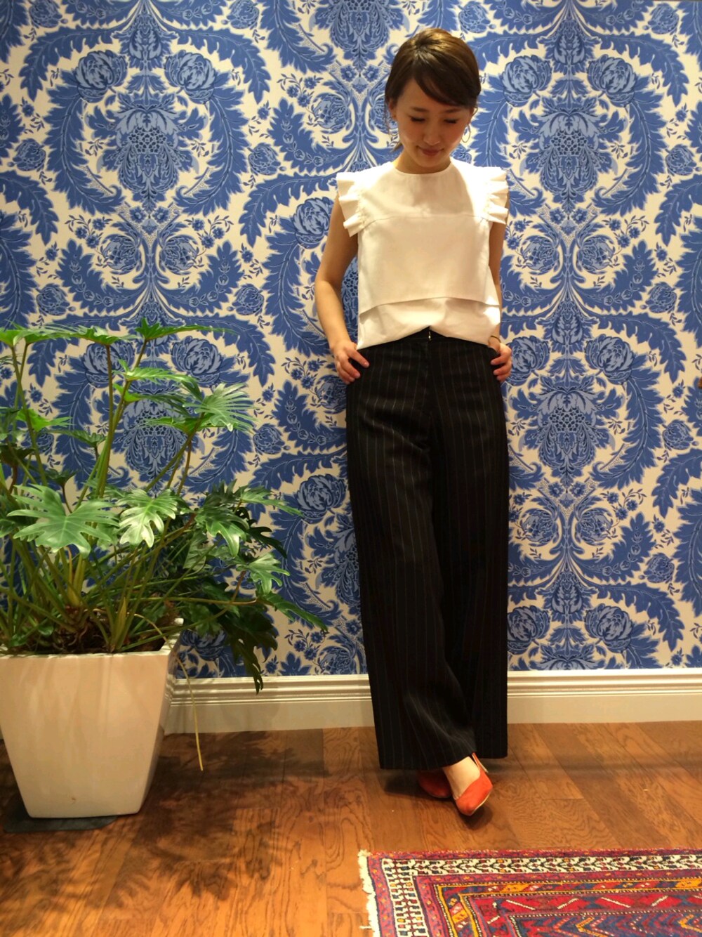 フリルギャザーのブラウスもワイドパンツとなら甘くなりすぎないですね♡
