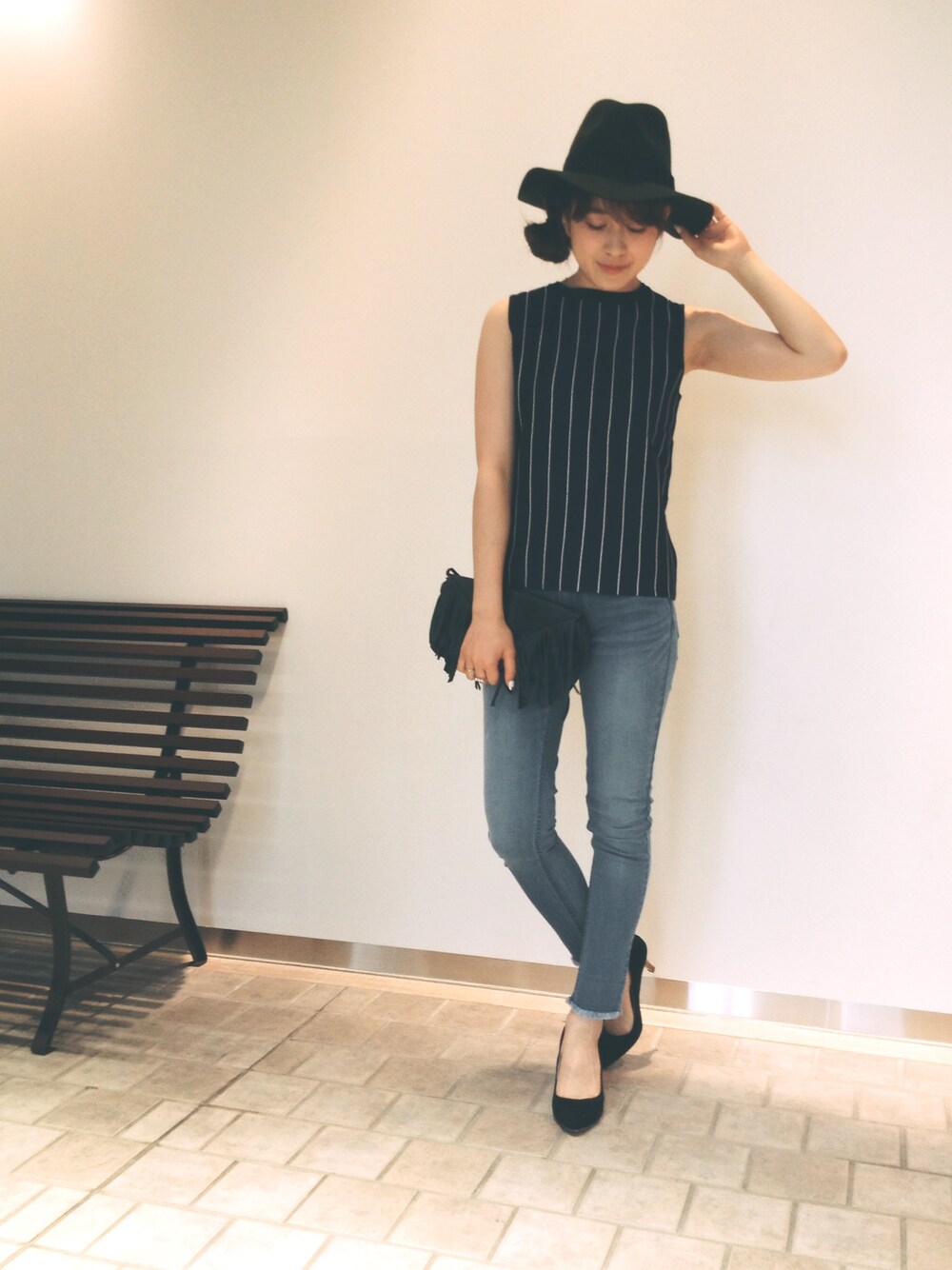 細めのストライプに細めのデニムで Iラインを強調してスタイルアップ。 ハットで目線を上げるとより 足が長く見えますよ👌🏻💗