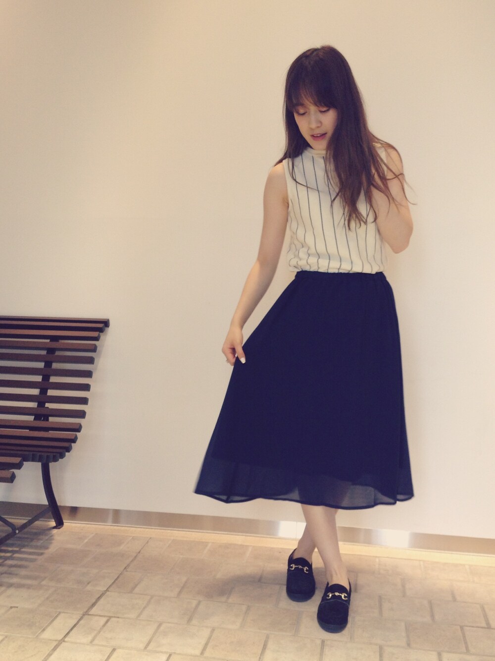 先日ご紹介したストライプのノースリニット🎀 白のストライプだと爽やかに着こなせます! オススメはエアリーなシフォンスカートと合わせて💗