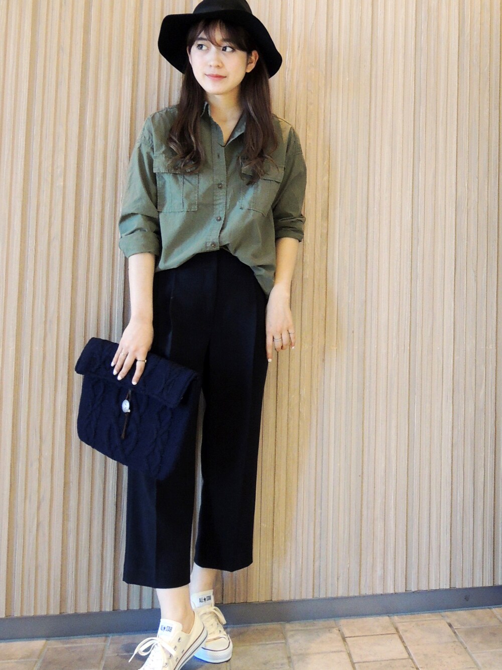 名前の通りこのシャツはメンズライクなサイズ感なので 襟を後ろにぬいてルーズ感をだして着るのが正解☆ シャツはきれいだけじゃなく、はずしアイテムとして使うのが今年流! ワイドパンツ合わせでもっとも旬なバランス感に。