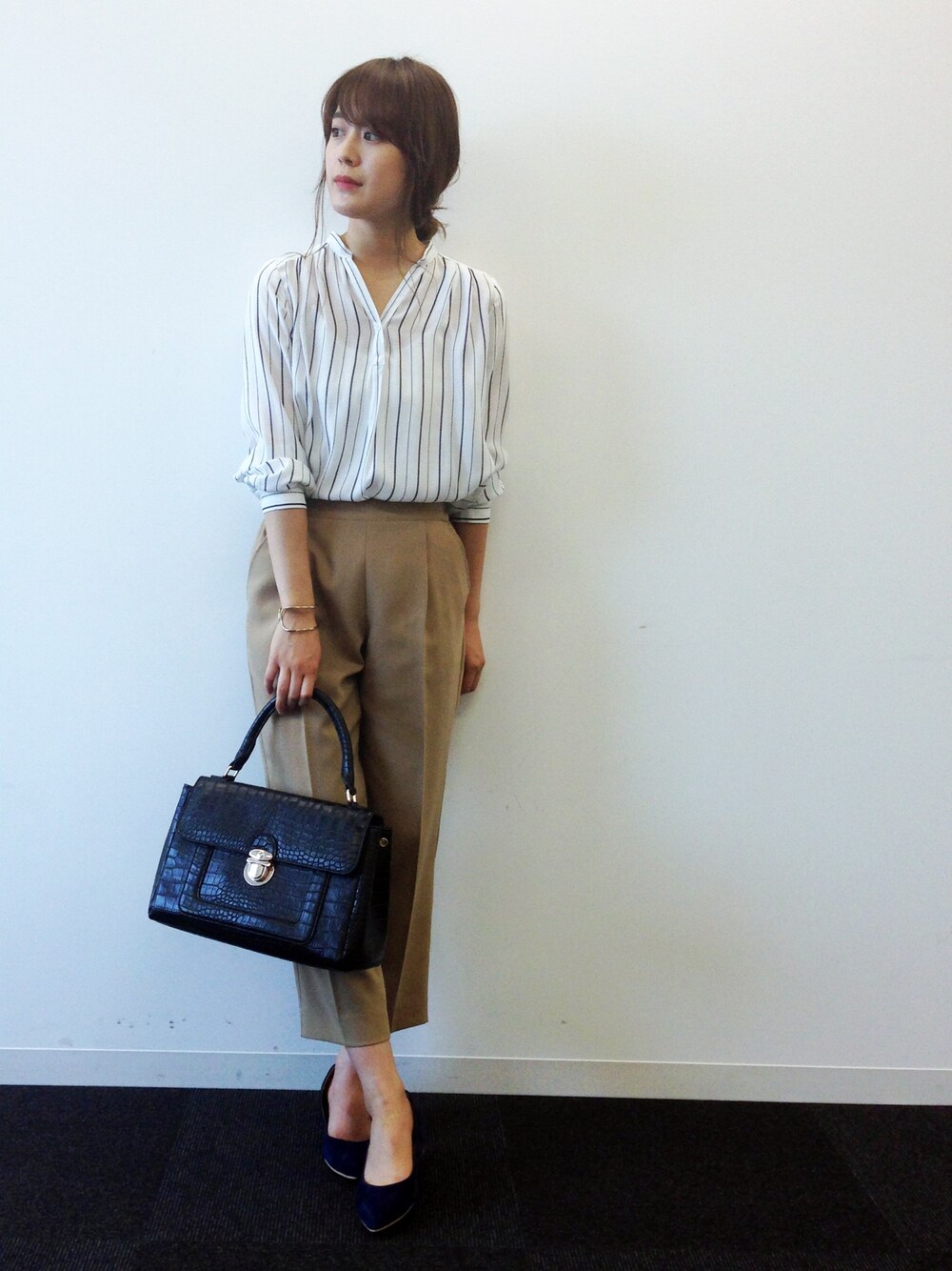 とろみのあるブラウスにストライプ柄だから Iラインを強調して着やせ効果も! ベージュやキャメルアイテム合わせに夢中♪