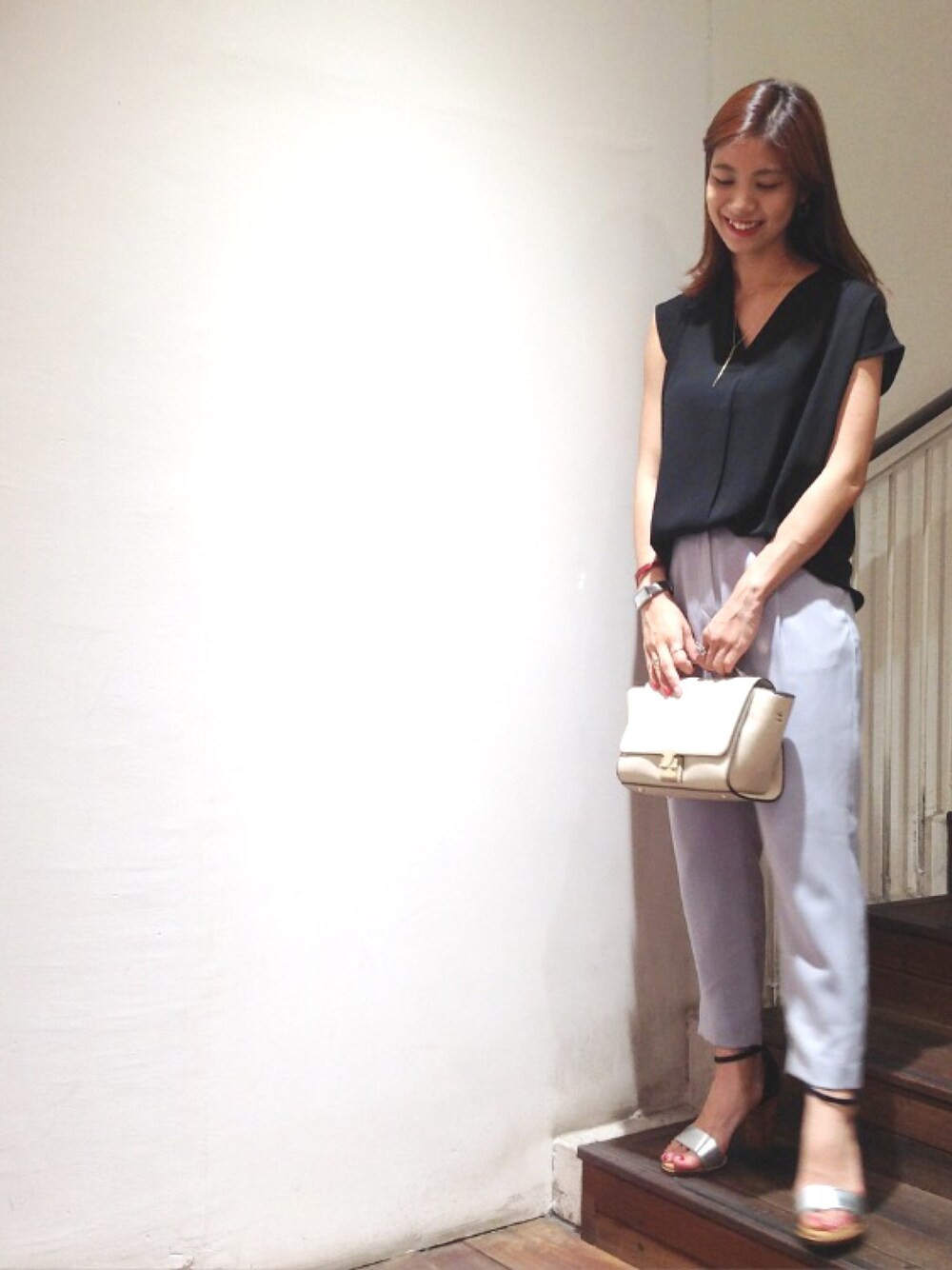 とろみ素材のシンプルコーデで上品に✨ ブラウスは胸開きがとてもキレイでオススメです☺︎