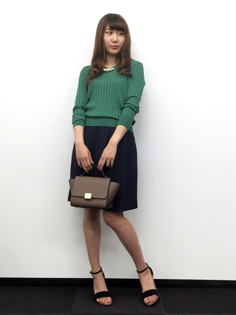 鮮やかなグリーンが目を引きますよね💜 フレアスカートと合わせてきれいめコーデ👌🏻