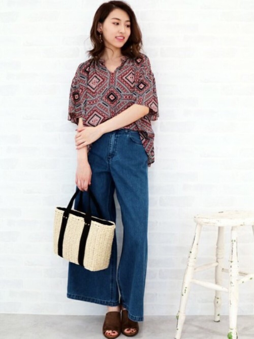 トップスのエスニックシャーリングブラウスは袖にボリューム感がありボヘミアン柄が可愛いアイテムです☆ とろみのある素材でボトムとの相性が良いですよ!