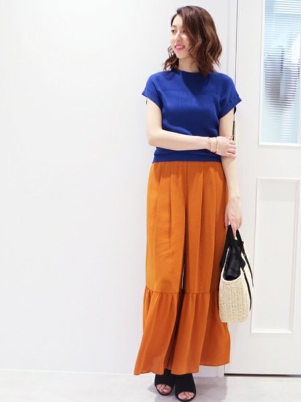 トップスのアゼノースリは清涼感のあるニットで夏場でも涼しく着れますよ☆ ビビットカラーが可愛く、パンツもカラーを取り入れて遊び心のあるコーディネートもいいですね~