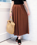 ボトムのカラーミモレスカートはレーヨン混のしなやかな風合で清涼感のあるアイテムです☆ ウエストゴムで締め付け感なく着れますよ!