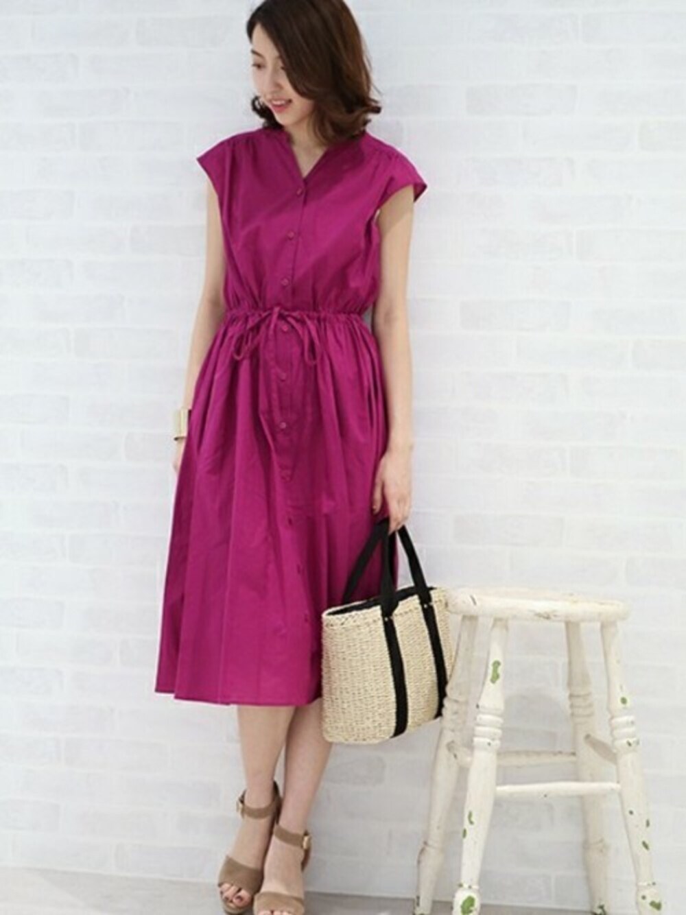 S.のワンピース「コットンローンミモレノースリーブワンピース」を使ったコーディネート