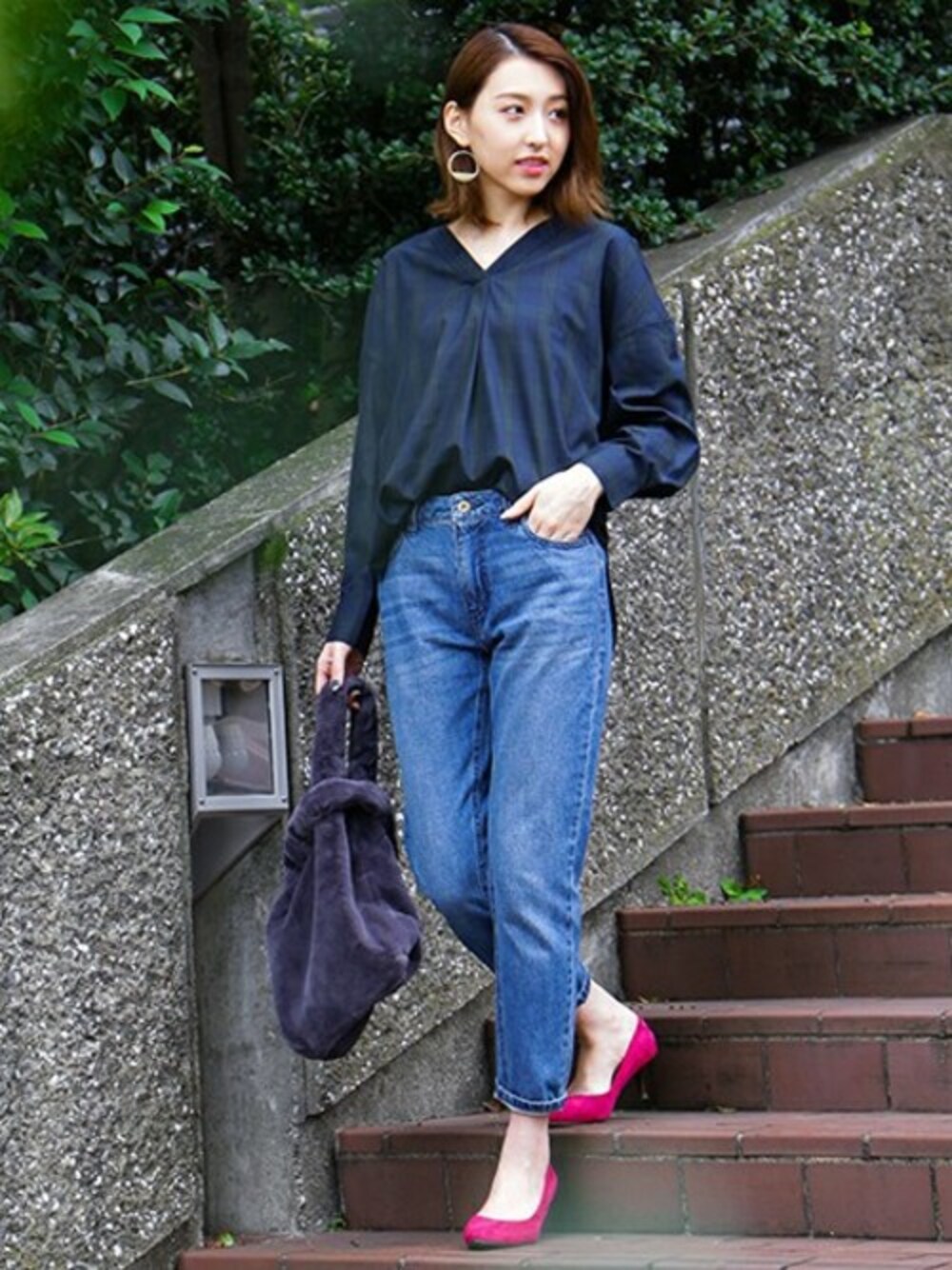 トップスのTCブロードチェックブラウスはVネックが首元をすっきり見せ、バックのリボンがポイントのアイテムです☆ チェック柄が秋らしく色んなコーディネートを楽しめますよ!