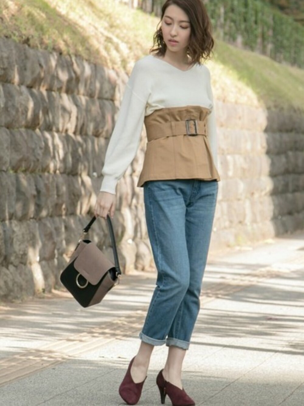 トップスのベーシックニットは少しふっくらしたフォルムが女性らしさを出してくれるアイテムです☆ ベーシックなデザインでどんなボトムとも相性が良いですよ♪