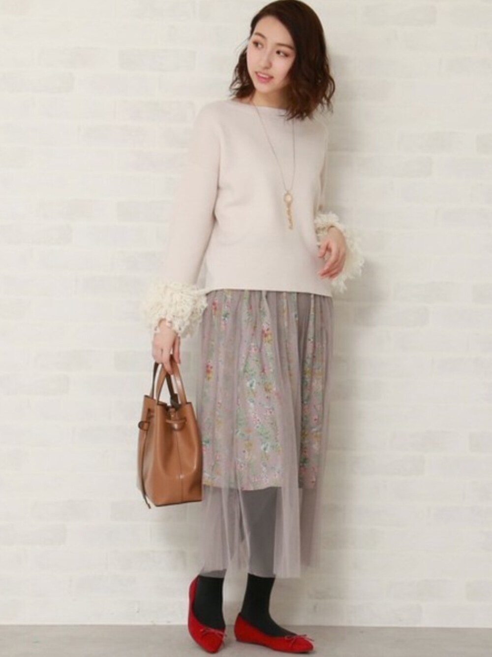 ボトムのチュールレイヤードスカートは花柄が可愛らしいアイテムです☆ 色のニットと合わせて全体的にガーリーな印象に仕上げてみました♪