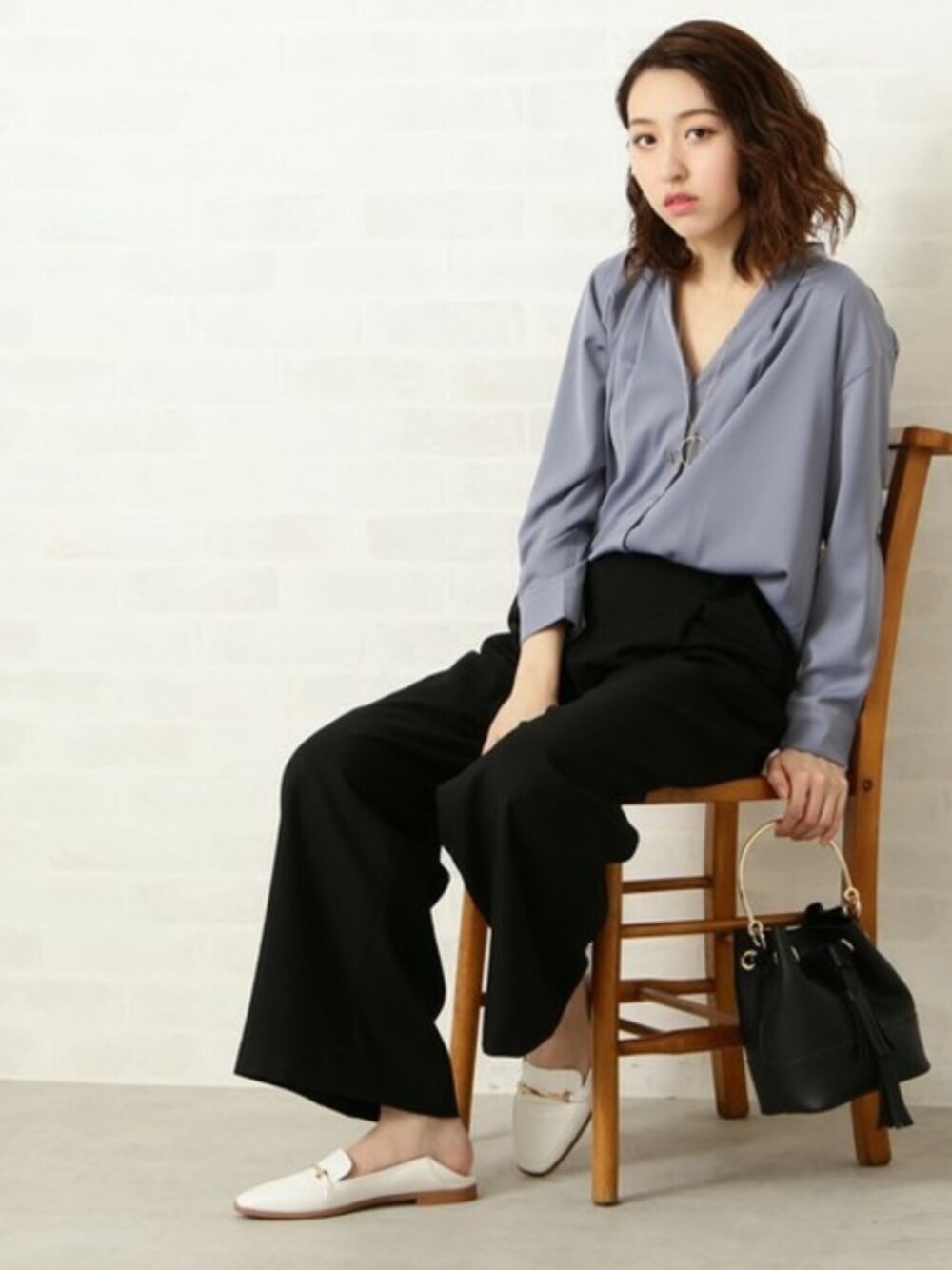 トップスのメタルボタンブラウスはVネックが顔周りをすっきりと見せてくれます☆ とろみのある生地でオフィスカジュアルに仕上げてくれますよ!
