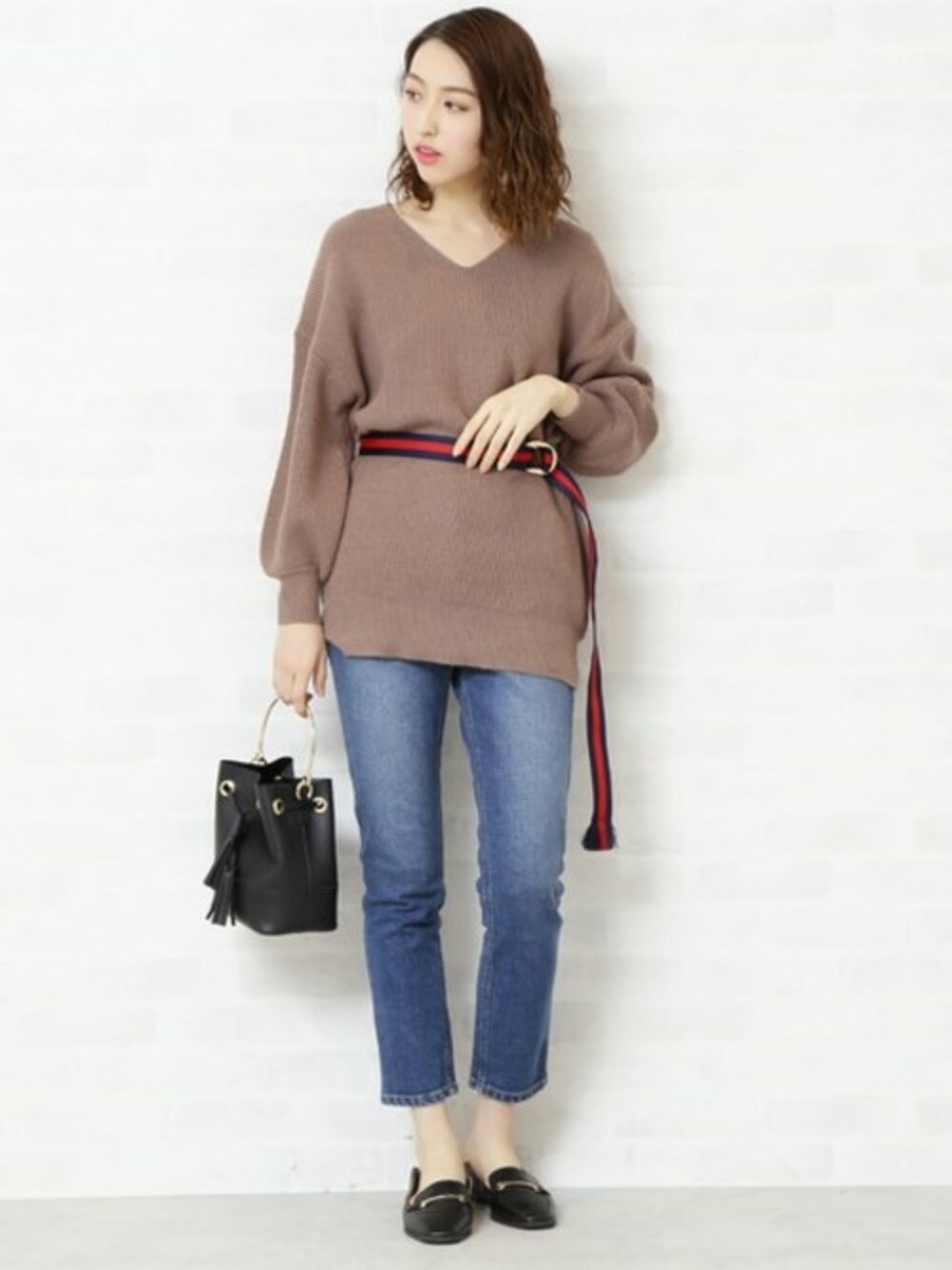 トップスのアゼVネックチュニックは袖が丸みの丈が長めのニットです♪ ベルトでウエストマークするとこなれ感が出ますよ!