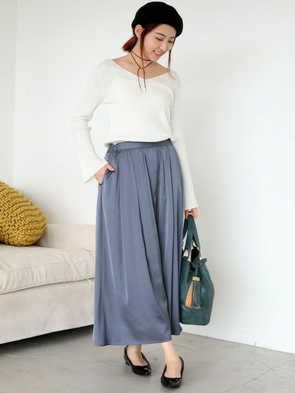トップスのリブフレアスリーブニットは柔らかな素材で着心地がよく、 袖がフレアスリーブになっていて女性らしさがアップします☆ ボトムのサテンガウチョは光沢感があってシンプルなトップスと合わせると存在感を放ちますよ! ウエストゴムで履きやすいのもポイントです♪