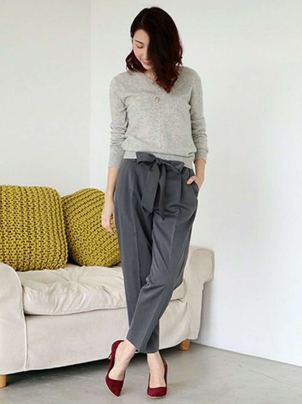 ボトムスのギャザーイージーパンツは、トップスをINしたときにウエスト部分のリボンがポイントになりますよ♪ 足首が見える丈が脚をスラッとした印象にしてくれます☆