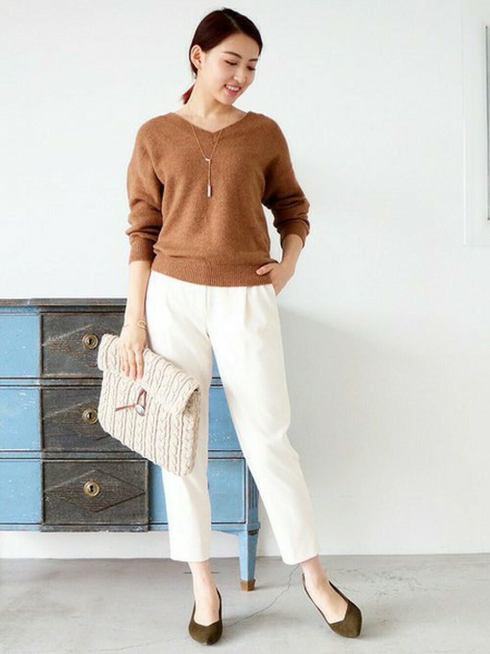 トップスのVネックニットはモコモコした素材感でしっとりとした質感が柔らかいですよ☆ ベーシックなデザインでパンツとの相性も抜群です!