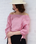 トップスのオフショルコットンリボンスリーブブラウスは爽やかなコットンで仕立てでデコルテをスッキリと見せてくれます! 細いストライプがマリン感を出してくれる可愛いアイテムですよ☆