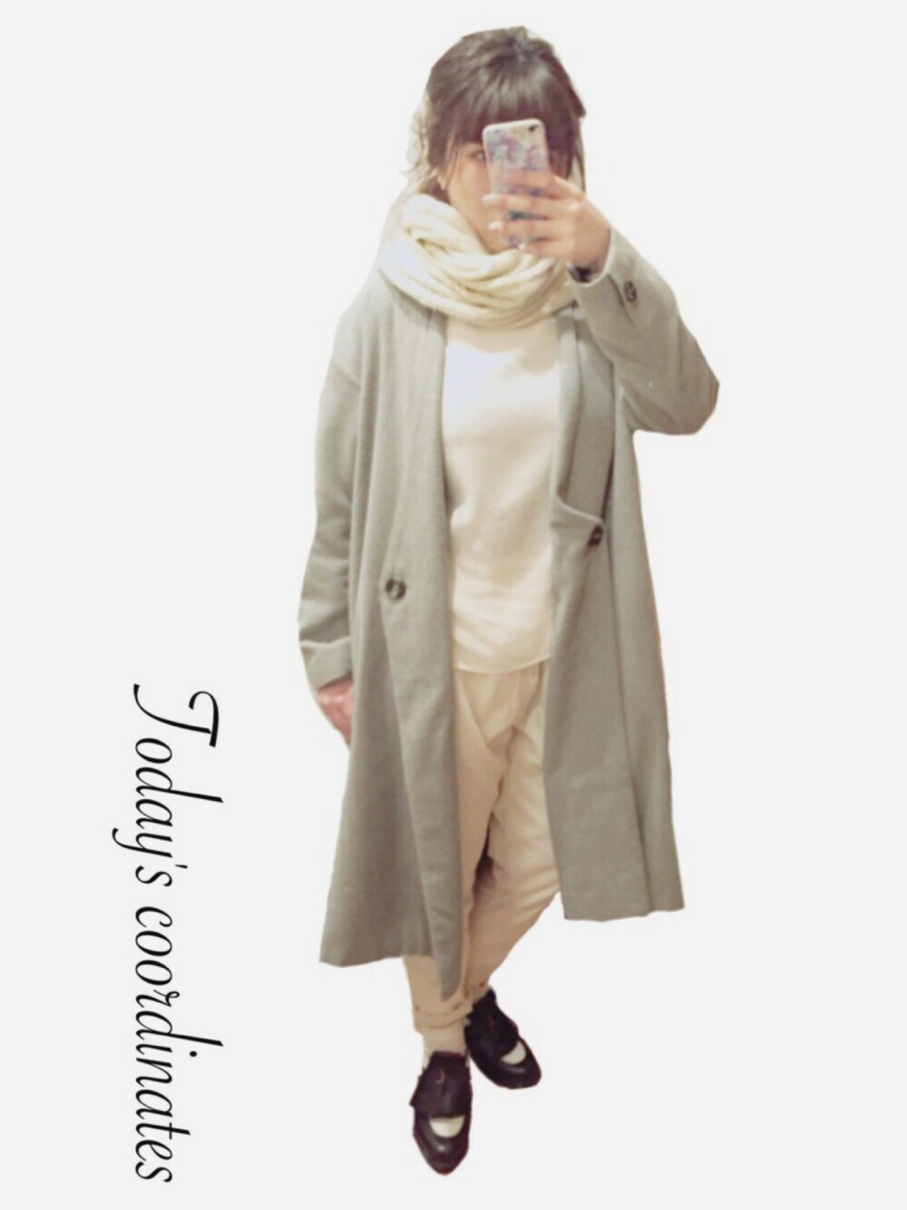 コートの中はオールホワイト。 靴に黒を入れて色を締めました。