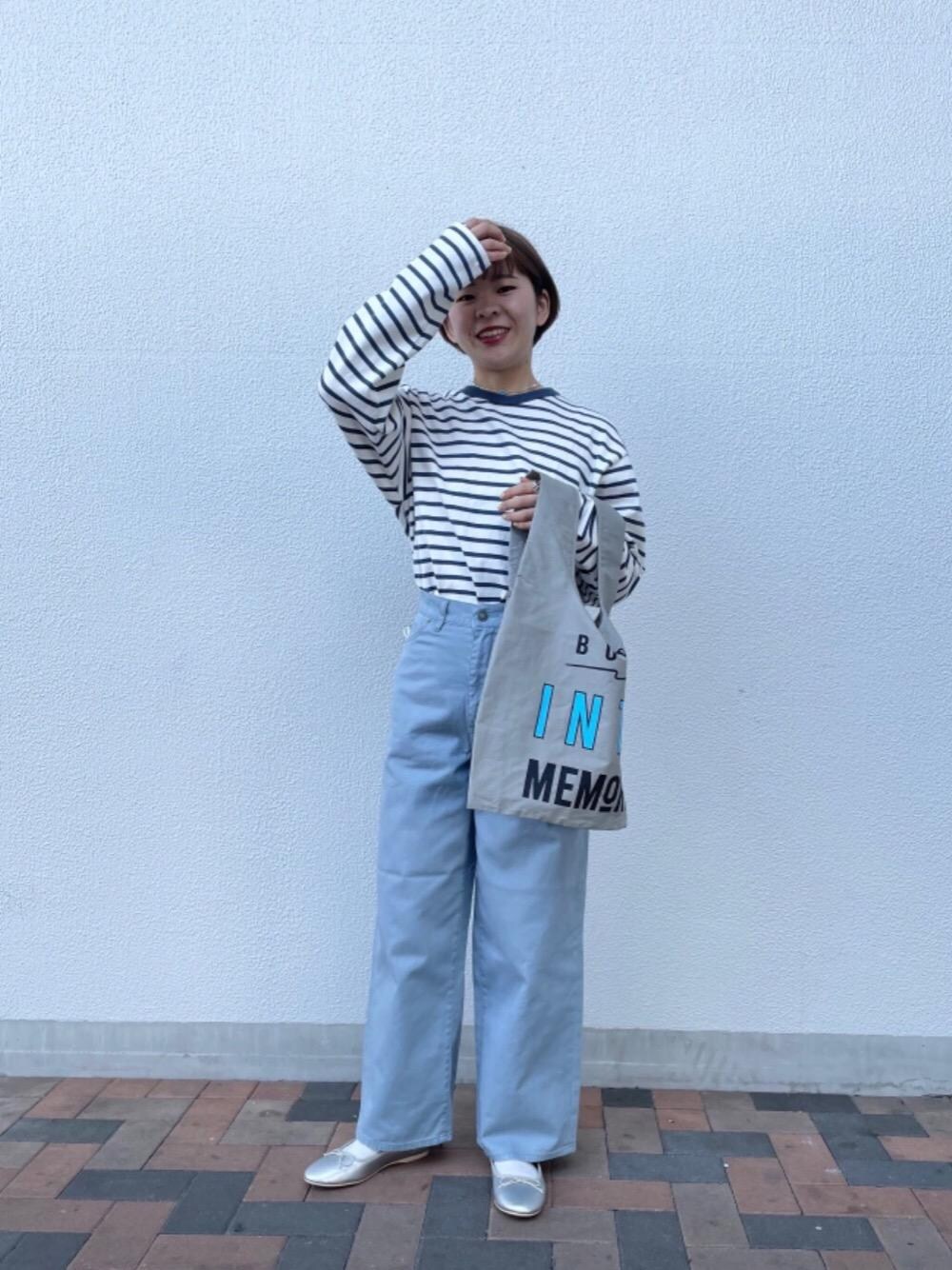 メンズのボーダートップスにカラーパンツを合わせました。 ボーダートップスは腕周りがゆったりしており、袖口が少し開いた形なのでオーバーサイズがお好きな女性にもオススメです!◎ カラーデニムは4色展開で、どのお色も春に使って頂きやすくなっています!また、ハイウエストなので美脚効果も抜群です!!