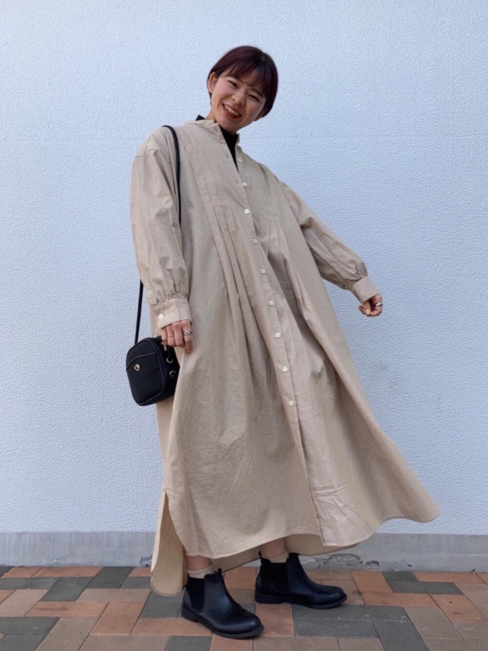 シャツワンピースを使って春らしくコーディネートしました。<br> <br>商品名:USAコットンマキシ丈タックシャツワンピース <br>サイズ感:全体的にゆったりとしたサイズ感で、丈も長いのでコートの様な感覚で羽織っていただくのにもぴったりです◎腕周りのパフになっているので重ね着した際のごわつきも気にならず、コーディネートに可愛らしさをプラスすることもできます! <br>素材感:透け感はありませんが、コットンが使われているのでさらっと着ていただけます◎