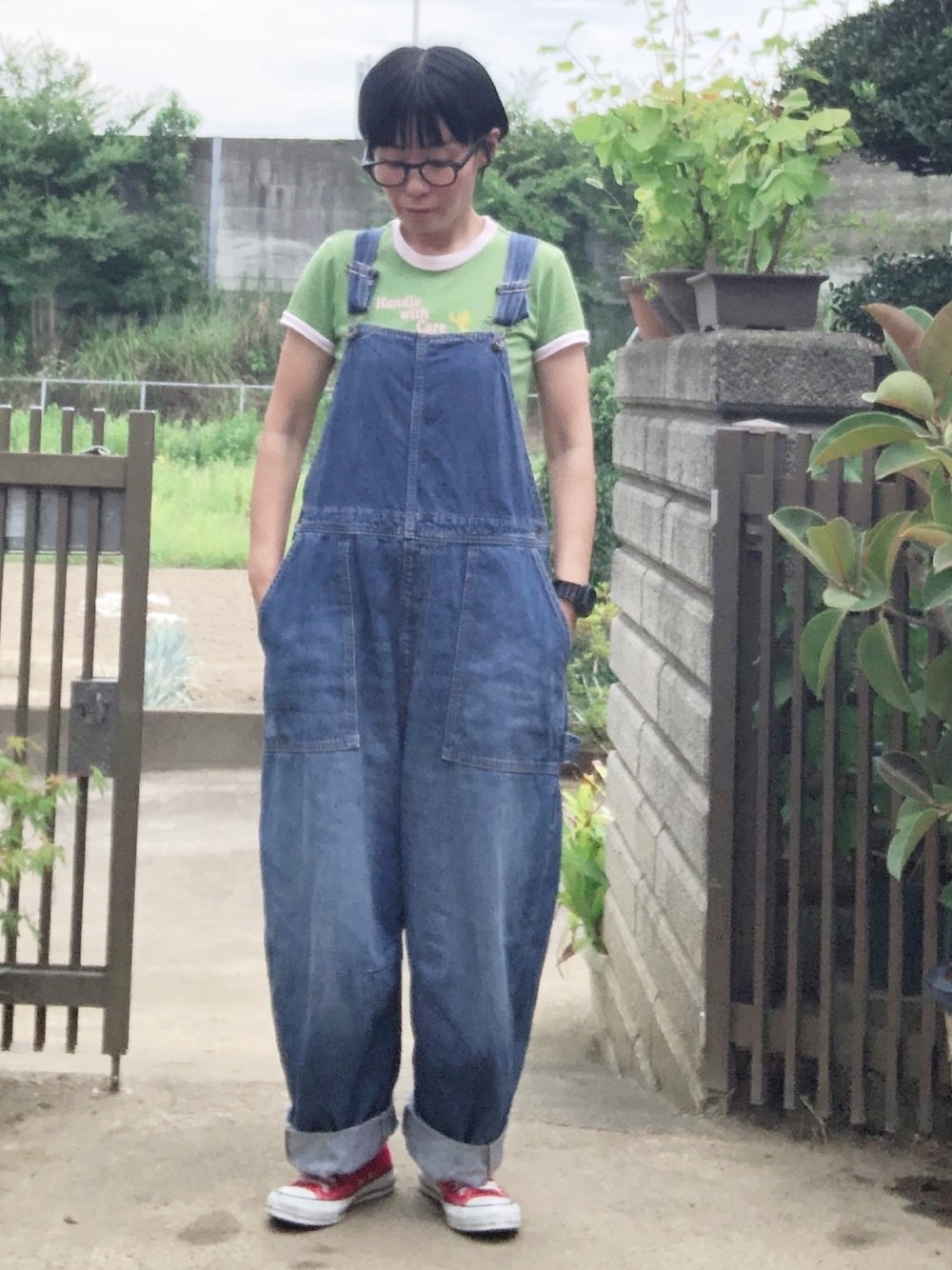 ずっと昔に着ていたTシャツを引っ張り出しました。チビTみたいなので、オーバーオールとコンバースでとことん90年代風に。