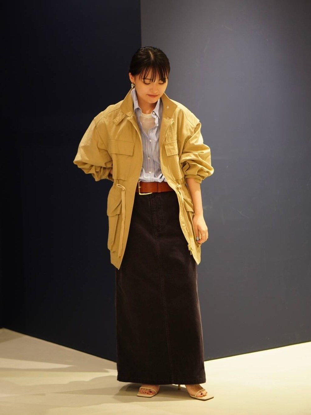 【ミリタリー2WAYブルゾン】 日常使いしやすい2WAYブルゾン。 袖を取り外しベストとしても使えるので、 長い期間着用できます! かなりゆったりしたサイズ感なので、 厚手のニットも着込むことができます。 ウエスト部分が絞れるので、小柄な方もバランス良く着用できます◎ 【イングレインビッグシャツ】 カレンソロジー定番のビッグシャツのデザインはそのままに柔らかさが増した新素材。 ゆったりとしたサイズ感で春夏は羽織としても活躍します! やや丸みのあるデザインで、抜襟をしなくてもこなれた印象に。 さりげないストライプなのでオンオフどちらも使いやすい◎ 【アンティークコールタイトスカート】 ヴィンテージライクな印象のコーデュロイスカート。 ウエストはゆったりした作りなので、 腰を落として履いていただきたいです! 画像ではヒールの高さが6.5cmのサンダルを着用。 ジャストウエストで履くとフラットシューズでも問題なく履けます。 太さの違うベルトループが2つ付いており、 ベルトのデザインで選べるようになっています。 やや硬めの素材感ですが、 後ろに深めのスリットが入っていることで足捌きもしやすいです! ベルト:オリジナル(Comming soon) 詳細はお気軽に店舗またはインスタまでお問い合わせお待ちしております︎︎☺︎ ☎︎06-6484-8448 / カレンソロジー心斎橋