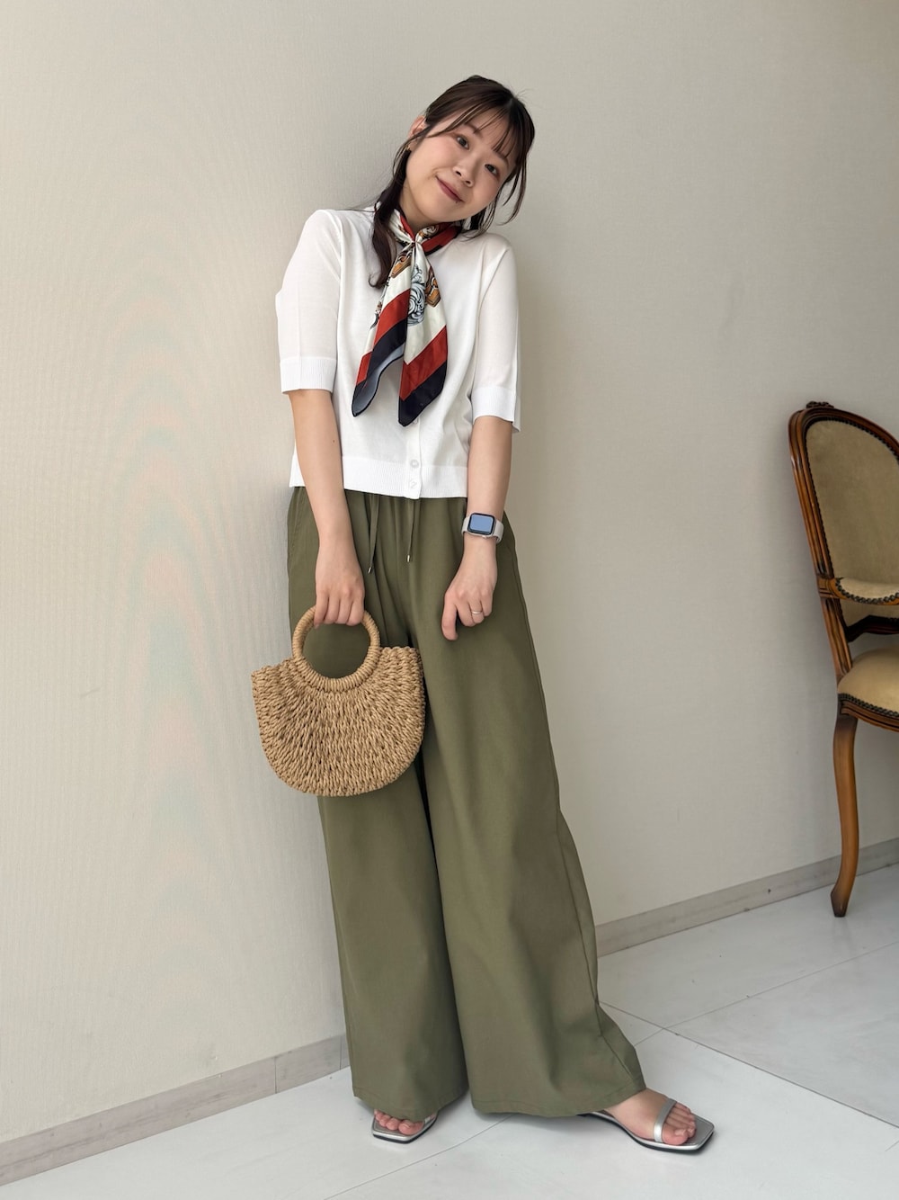 スカーフを合わせたゆるっとフレンチコーデ! 夏に涼し気な5分袖のカーディガンに、 サラッとした触り心地の麻調ワイドパンツ。 夏のお出かけコーデはこれで決まり٭𓈒𓏸 身長:154cm 骨格:ストレート 着用:Mサイズ