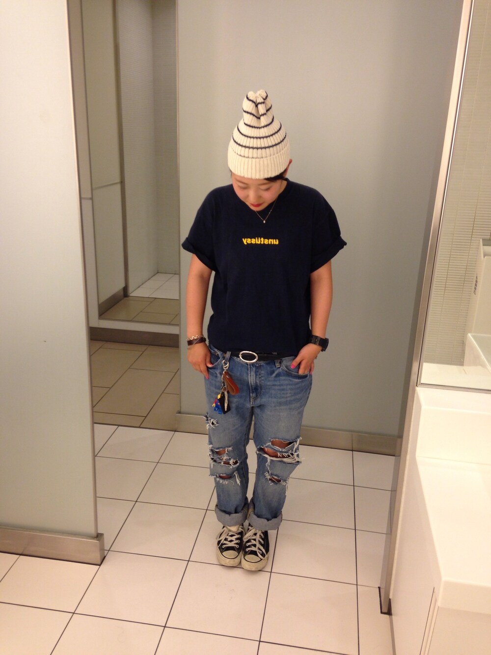 ニット帽がとんがり帽みたいにみえる、、 デニムは、UNIQLOのメンズサイズ着てます。 ダメージ加工は、セルフです☺︎